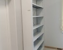 Для экономии средств были установлены стационарные двухсторонние стеллажи для библиотеки, расположенные рядами по центру помещения. Вдоль стен использовали односторонние стеллажи, максимально задействовав всё рабочее пространство. Высота стеллажей была спроектирована так, чтобы все полки оставались в пределах досягаемости без использования стремянки. Ширина полок соответствовала ширине книг, что исключило пустое пространство и позволило разместить больше учебников.