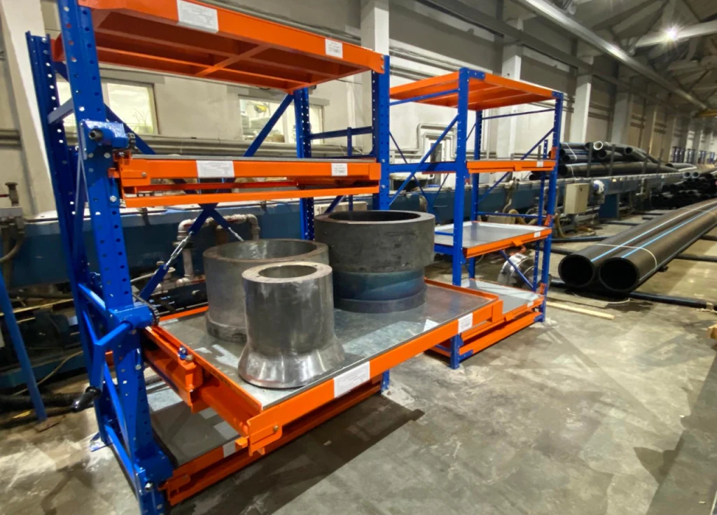 Стационарные стеллажи с полками полного выдвижения для хранения оснастки, инструмента и других предметов с механизмом защиты и нагрузкой на полку до 200 кг.