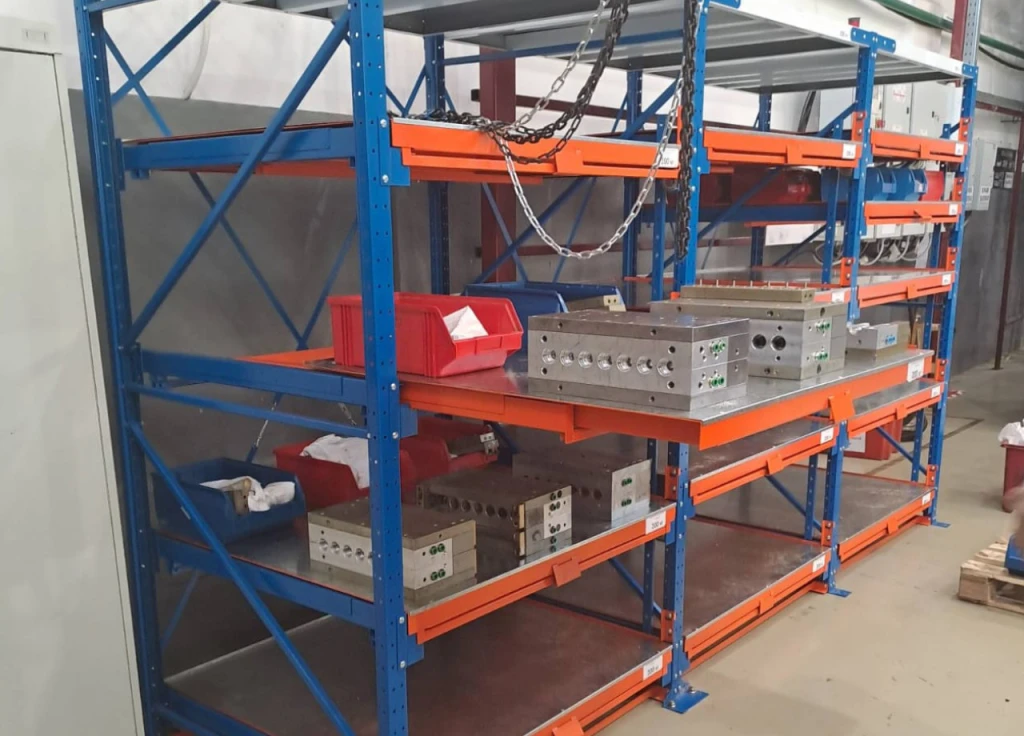 Среднегрузовые металлические стеллажи с полками полного выдвижения для хранения оснастки, инструмента и других предметов с механизмом защиты и нагрузкой на полку до 200 кг.