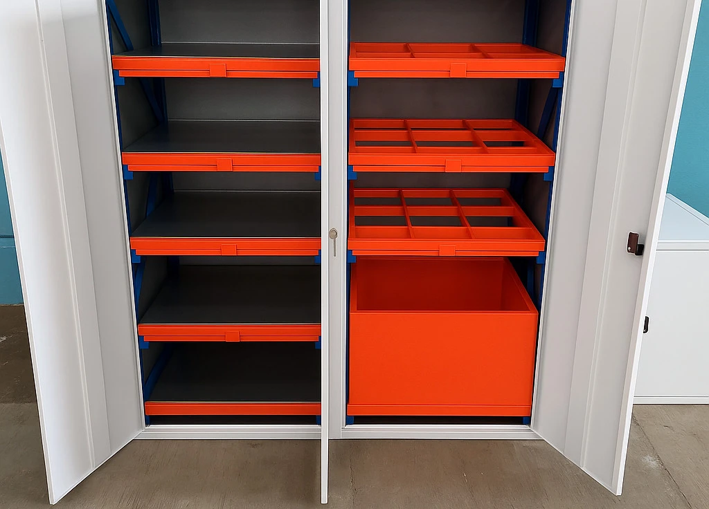 В составе стеллажа идут двери, полки полного выдвижения с несущей способностью до 200 кг, контейнеры или ящики. Для инструментально-раздаточных кладовых, складов метизной продукции и деталей.