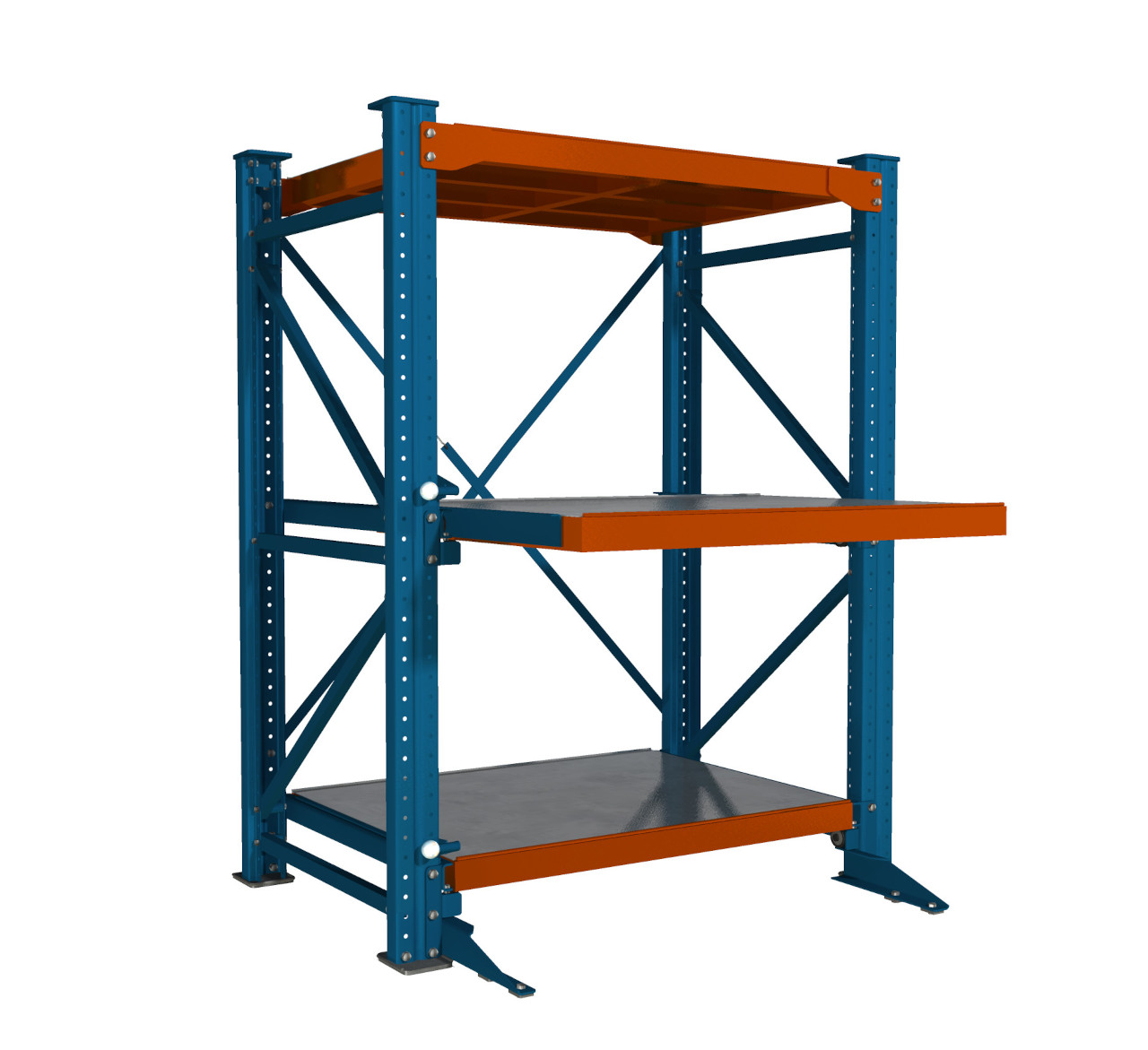 Каждая полка выдерживает нагрузку до 1000 кг, что обеспечивает надёжное хранение массивных и габаритных предметов без риска деформации и потери устойчивости. Полки выдвигаются на 70%, обеспечивая удобный доступ к содержимому при сохранении прочности и жёсткости конструкции.